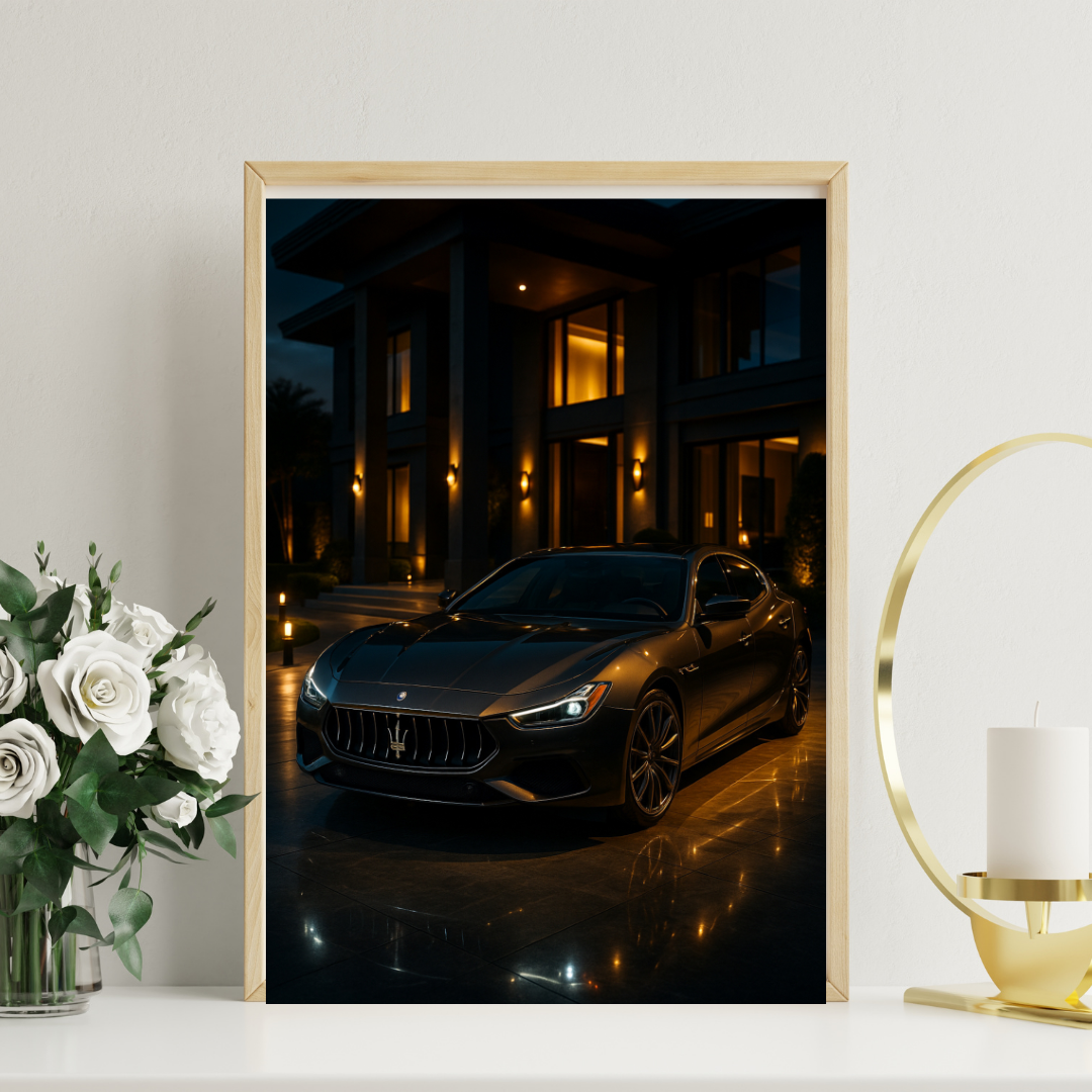 A luxurious black sedan parked before a high-end villa, captured during the golden glow of twilight. This artwork adds a rich, exclusive ambiance to any upscale living space or office.