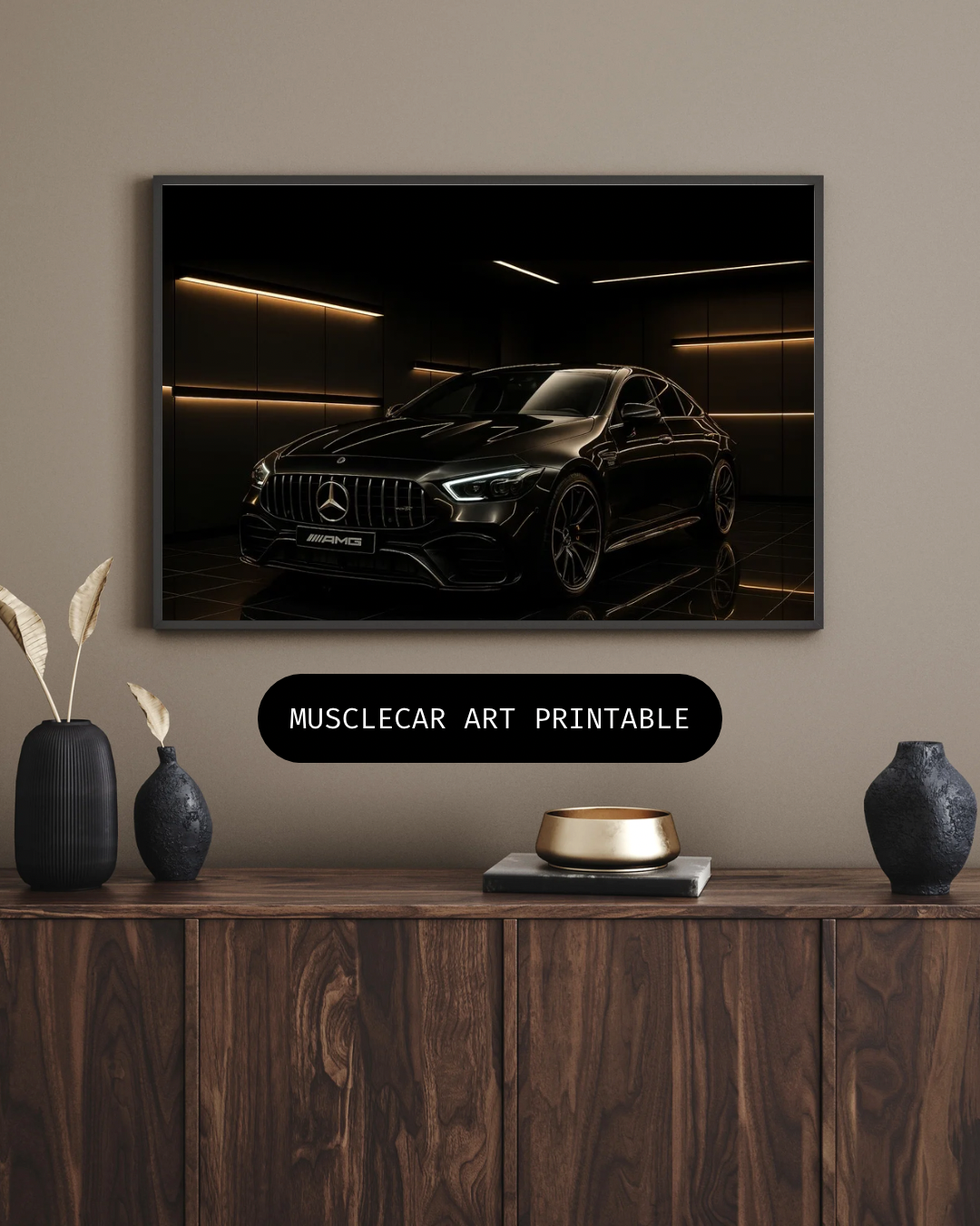 Bring sophistication into your space with this sleek black luxury sedan in a dark, high-end showroom. A digital art print that radiates power, elegance, and premium design. Perfect for modern offices, living rooms, or man caves.