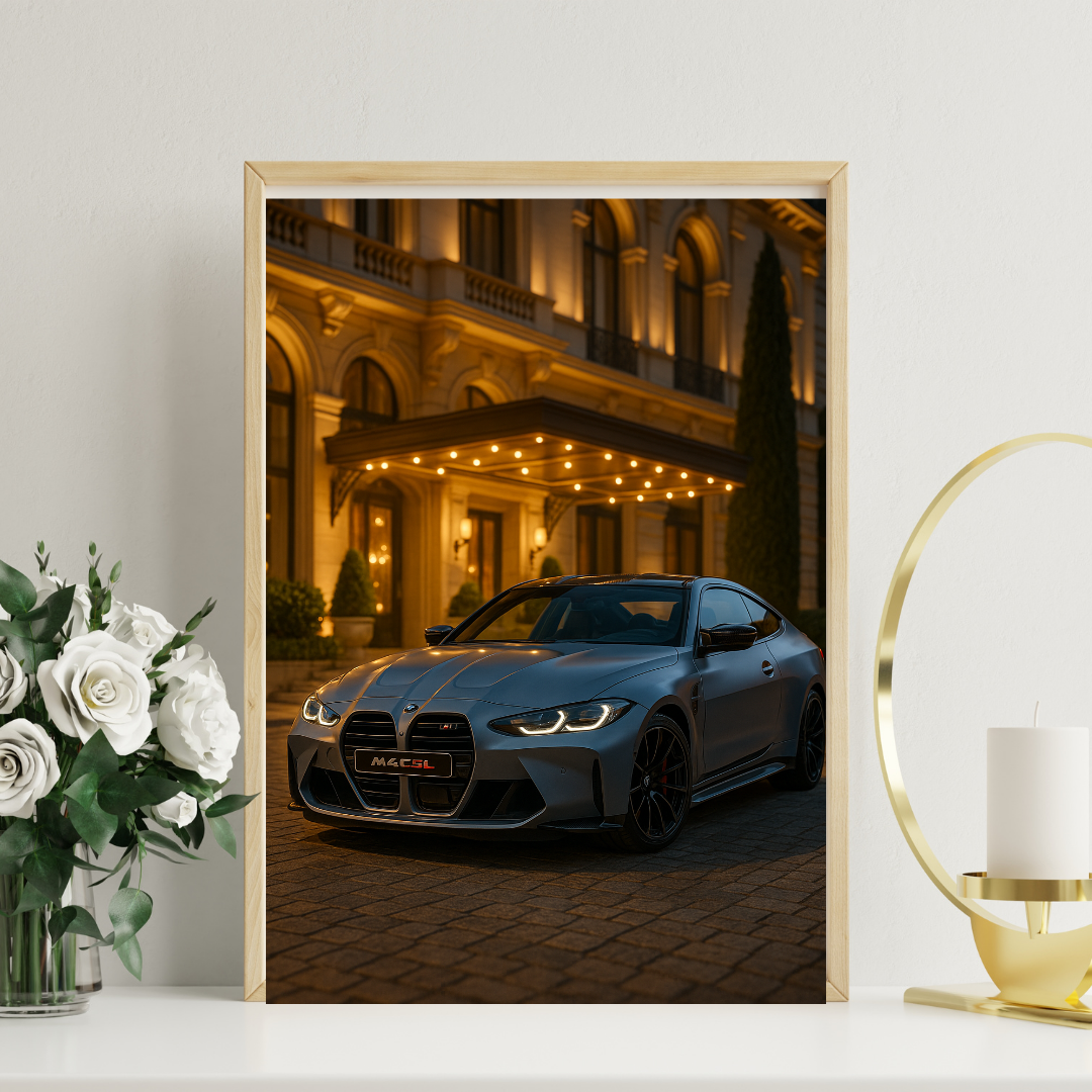 This stunning digital artwork features a high-performance coupe parked at an opulent hotel entrance. A blend of elegance and speed – made for interiors with character and ambition.
