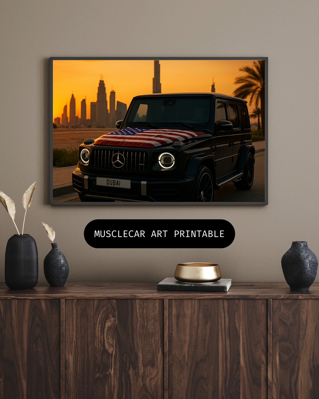 Bring luxury and bold identity into your space with this stunning digital art print featuring a black high-end SUV cruising through the golden Dubai desert. Set against a breathtaking skyline and sunset, this piece captures power, pride, and elegance in motion.