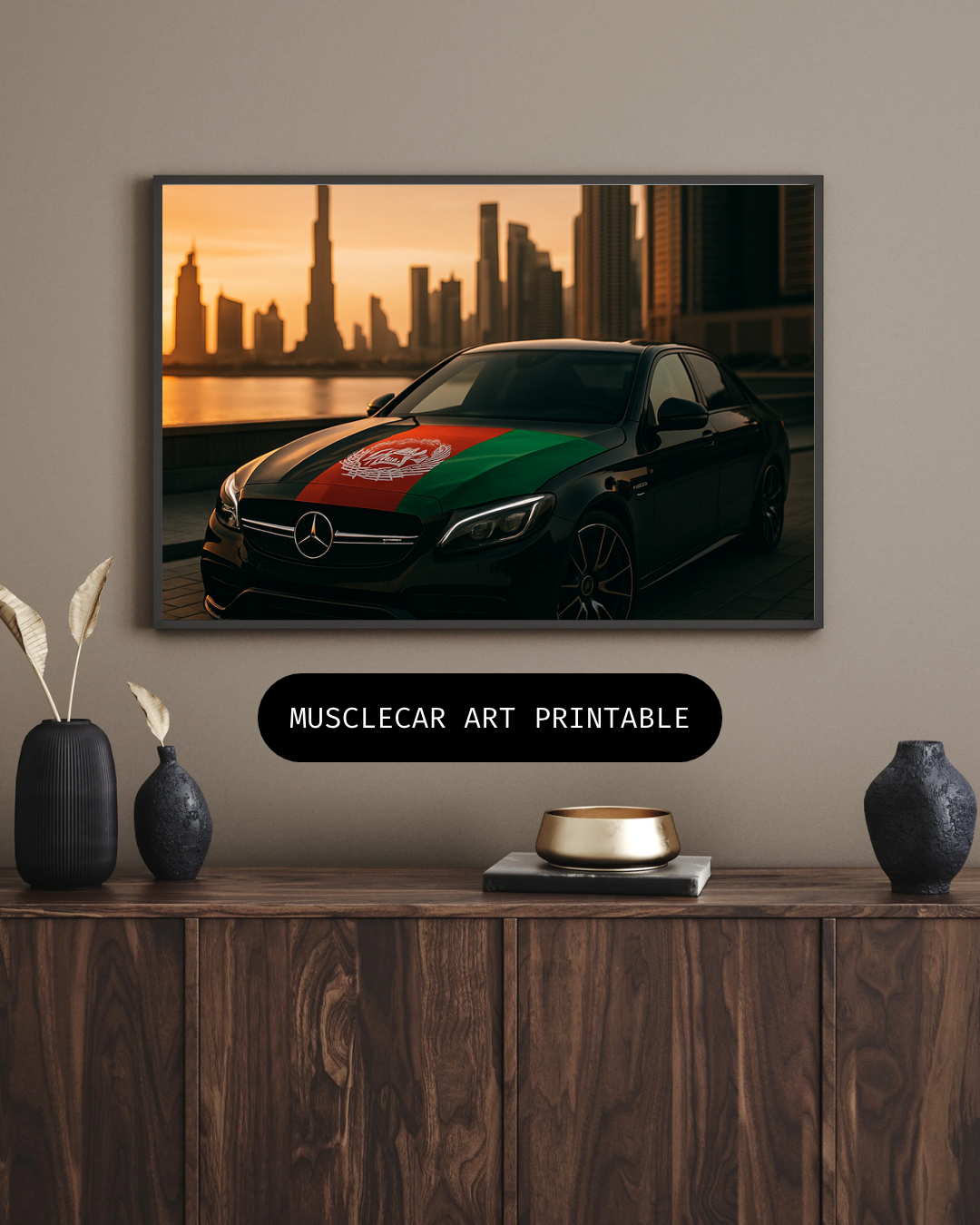 Perfect for modern interiors, offices, or masculine spaces, this piece speaks to those who value performance, prestige, and identity. Set against a sunset-lit city backdrop, it’s more than just a car – it’s a lifestyle.