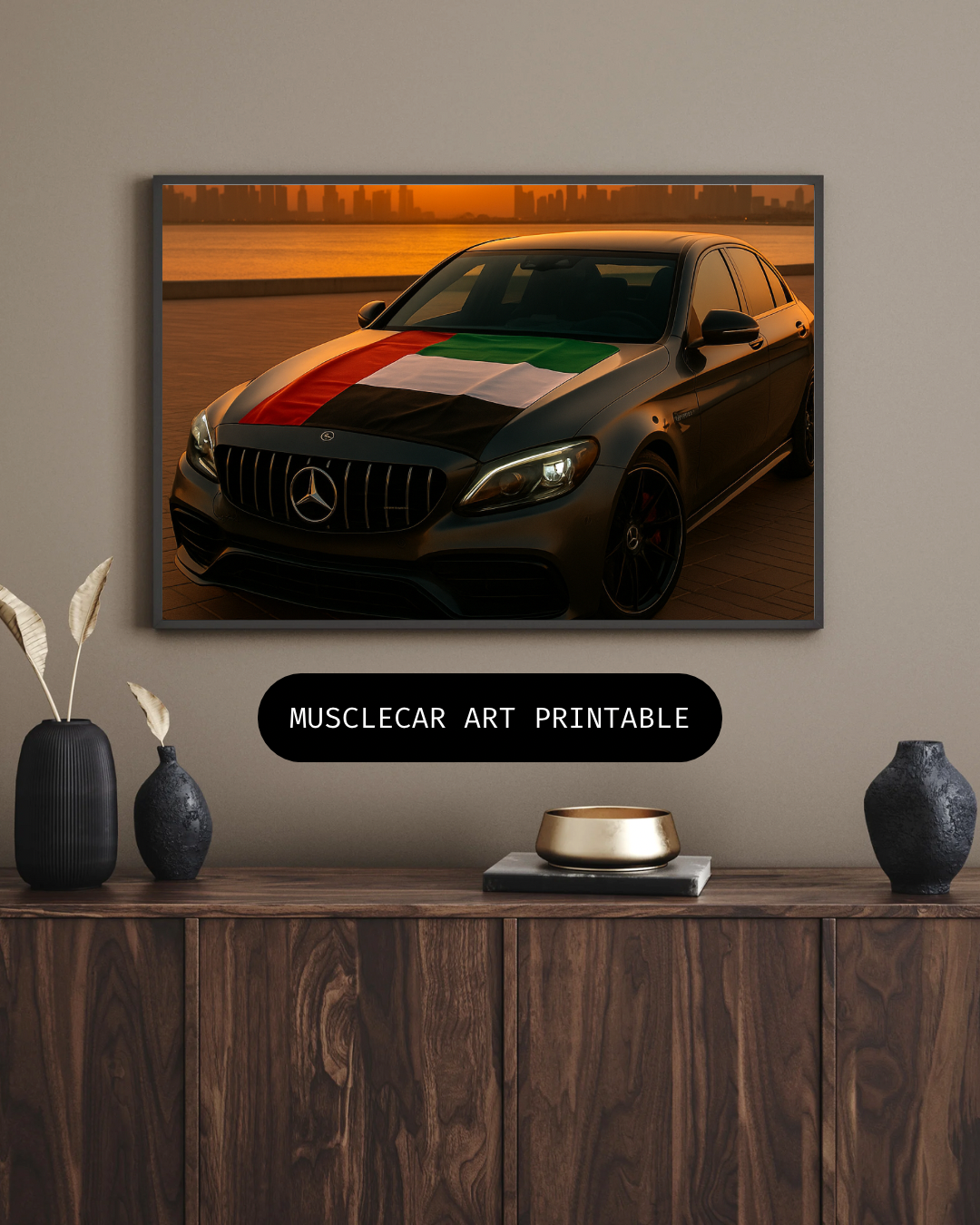 Perfect for modern interiors, offices, or masculine spaces, this piece speaks to those who value performance, prestige, and identity. Set against a sunset-lit city backdrop, it’s more than just a car – it’s a lifestyle.