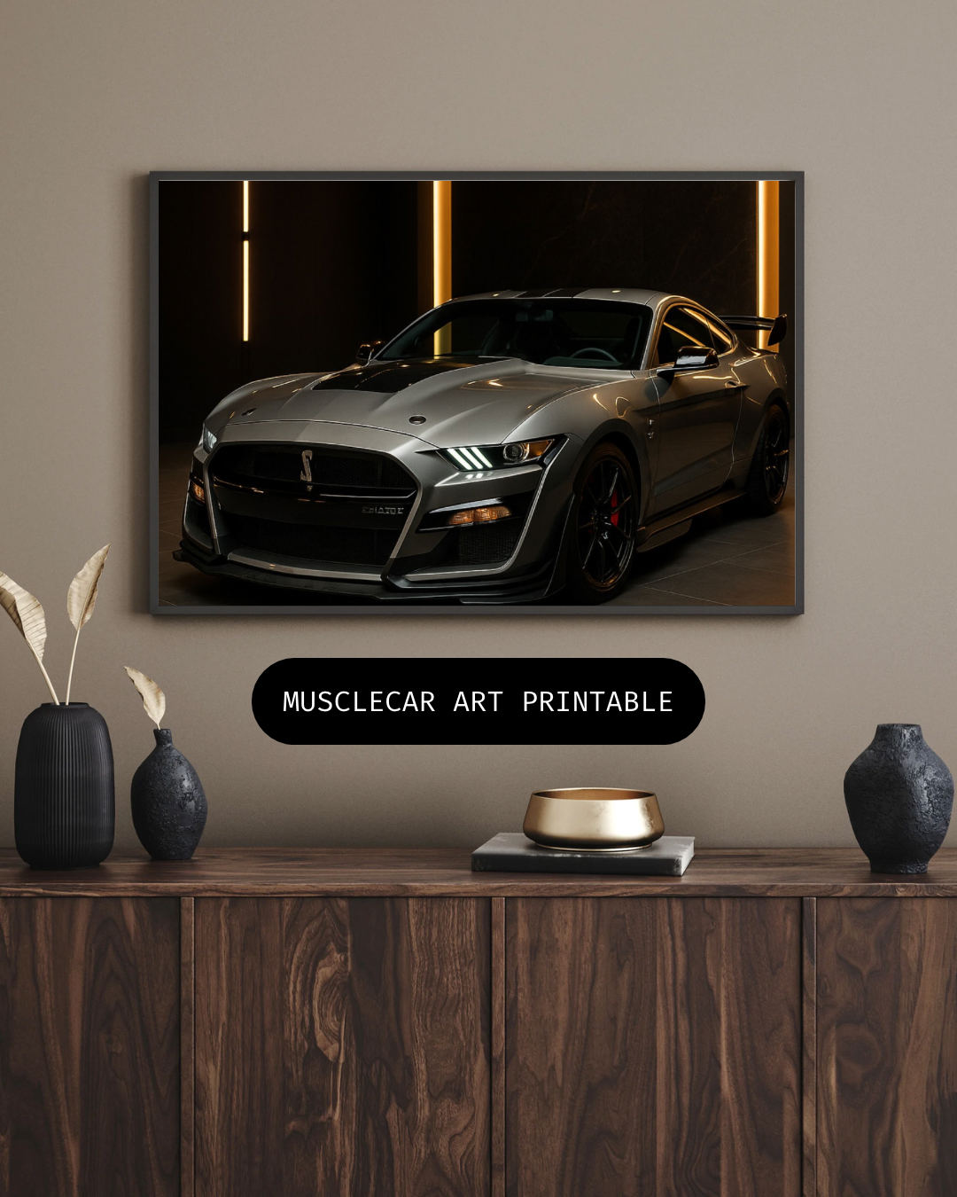 Add energy and style to your walls with this silver muscle sports car, captured in a bold and atmospheric garage setting. Ideal for masculine interiors, gaming rooms, or minimalist homes with a passion for design and performance.