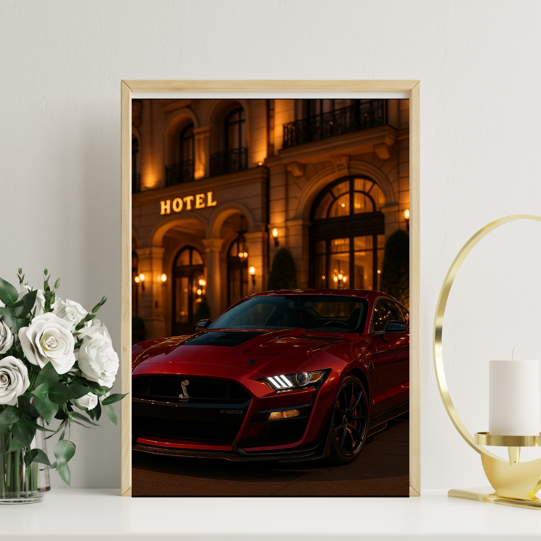 A bold red muscle coupe parked in front of a historic hotel facade at night. This premium art print evokes timeless class and fierce performance – ideal for gentlemen’s rooms and refined lounges.