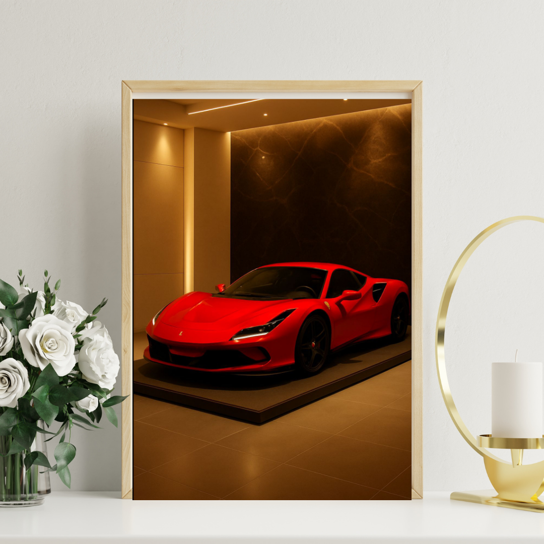 This high-end digital art print features a sleek red supercar displayed in an elegant ambient-lit setting – perfect for automotive lovers and design enthusiasts alike.