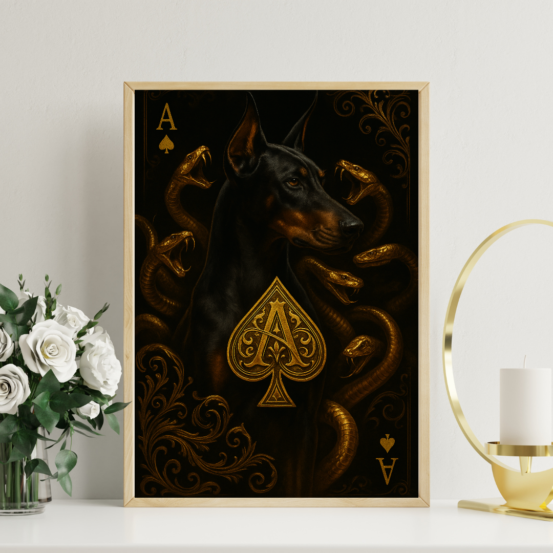 Command attention with this powerful digital art piece: a regal Doberman surrounded by golden serpents and crowned by the iconic Ace of Spades. The rich black and gold palette, baroque flourishes, and intense symbolism create a statement of strength, mystery, and elite presence.